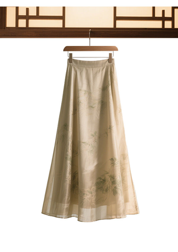 突破传统平面剪裁,采用高腰A字廓形结合侧开衩设计,行走时裙摆如涟漪舒展,既修饰腰臀线条,又赋予步履灵动诗意.腰间缀以手工盘扣或玉石系带,点睛东方意蕴;裙身褶皱借鉴希腊雕塑垂直线条,通过斜裁拼接形成动态延伸感,行走即成流动艺术品. 百搭之美·跨越场景 黛青,月白,檀褐等低饱和色调衬出东方含蓄之美,可搭配简约针织衫打造通勤优雅,亦可叠穿国风短褂演绎雅集风韵.内衬采用亲肤蕾丝或网纱,兼顾舒适性与朦胧美感,从职场到茶会皆游刃有余.